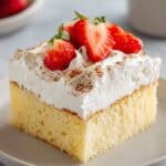 - Frost and Garnish: Once the cake has soaked and chilled, spread the whipped cream topping evenly over the cake surface. Garnish with a light dusting of ground cinnamon and/or fresh strawberries for a colorful finish.