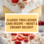 Tres Leches Cake is a moist and decadent Latin American dessert made with a light sponge cake soaked in a rich mixture of three kinds of milk—evaporated milk, sweetened condensed milk, and whole milk—topped with fluffy whipped cream and garnished with cinnamon or fresh strawberries. This recipe offers a perfect balance of sweetness and creaminess, ideal for celebrations or any special occasion.